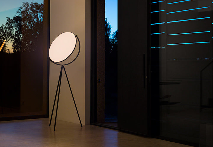 Superloon is een zeer wendbare vloerlamp met ronde schijf op een frame van geverfd of verchroomd aluminium; de ring waarin de lamp zich bevindt, is gemaakt van PMMA. Met behulp van een sensor op het statief kan het licht feller of koeler gemaakt worden.