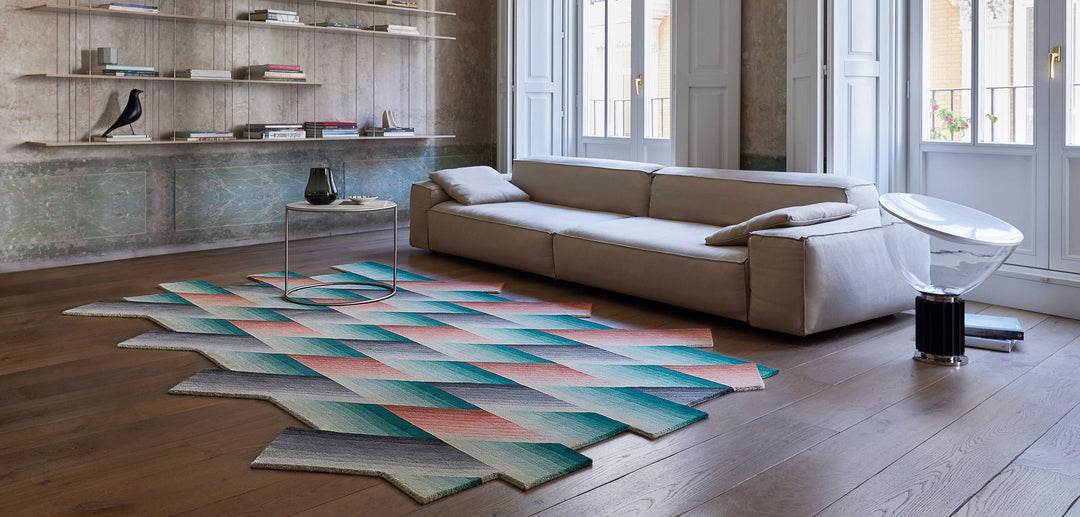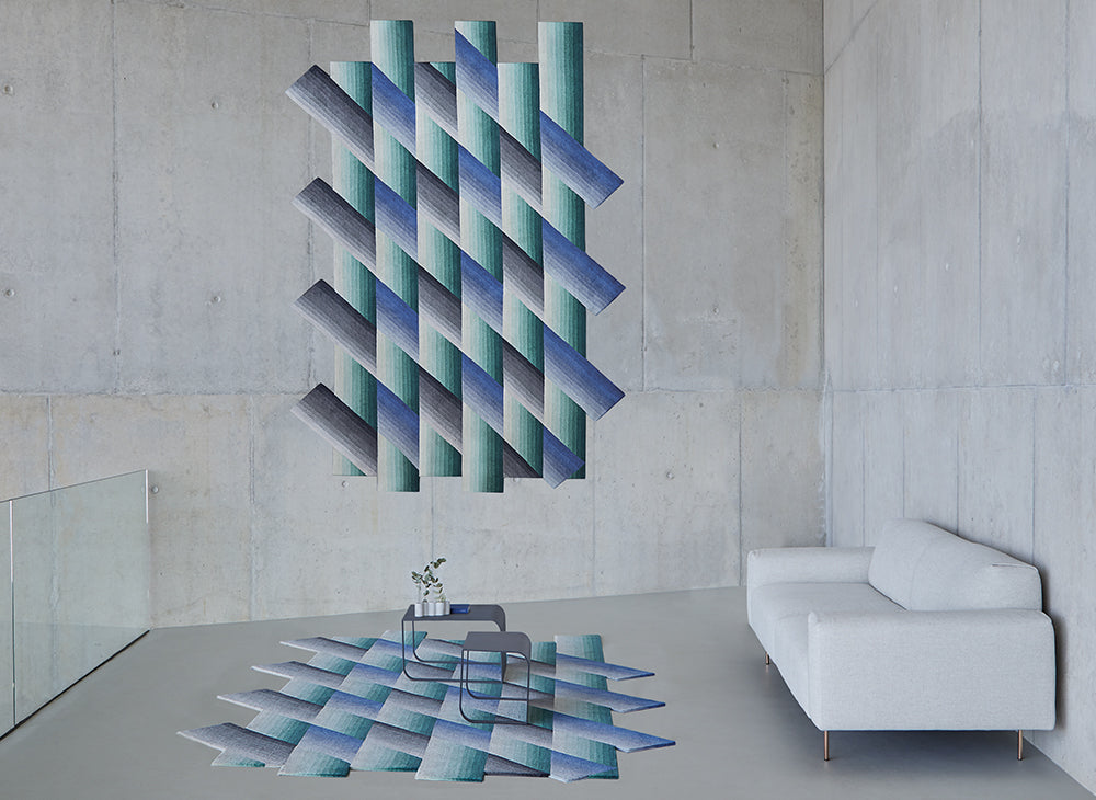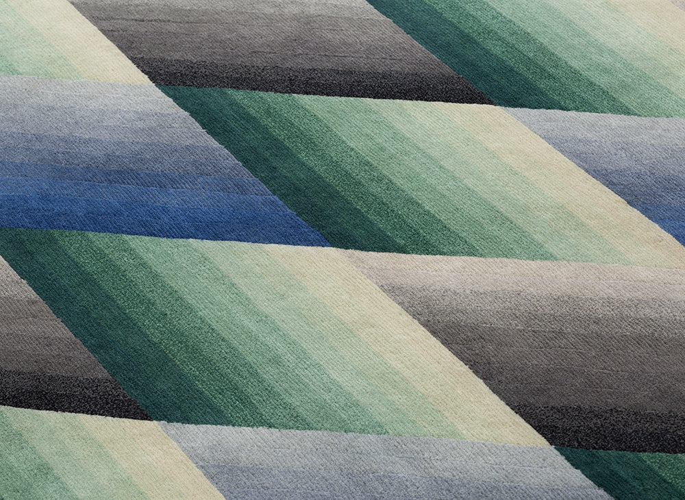 De Mirage is een wollen tapijt dat gekenmerkt wordt door een nieuwe vorm. Gekleurde banen worden met elkaar vervlochten, waardoor onregelmatige randen ontstaan. Het vloerkleed is geïnspireerd door de optische kunst. Het geheel geeft een gevoel van diepte en beweging.