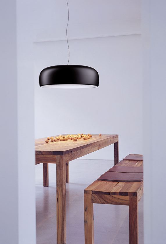 De Smithfield hanglamp is een strak vormgegeven lamp, die verkrijgbaar is in mat zwart en diverse, glanzende kleuren. Bij elke kleur is de binnenkant van de lampenkap wit. De diffuser voorkomt direct zicht op de lichtbron en verspreidt het licht zacht naar beneden. Daardoor doet de lamp het goed boven een eetkamertafel. Uitgevoerd met plafondbevestiging met stalen ophangkabel en dimbaar via een externe dimmer. Naast de hanglamp is er de Smithfield plafondlamp.