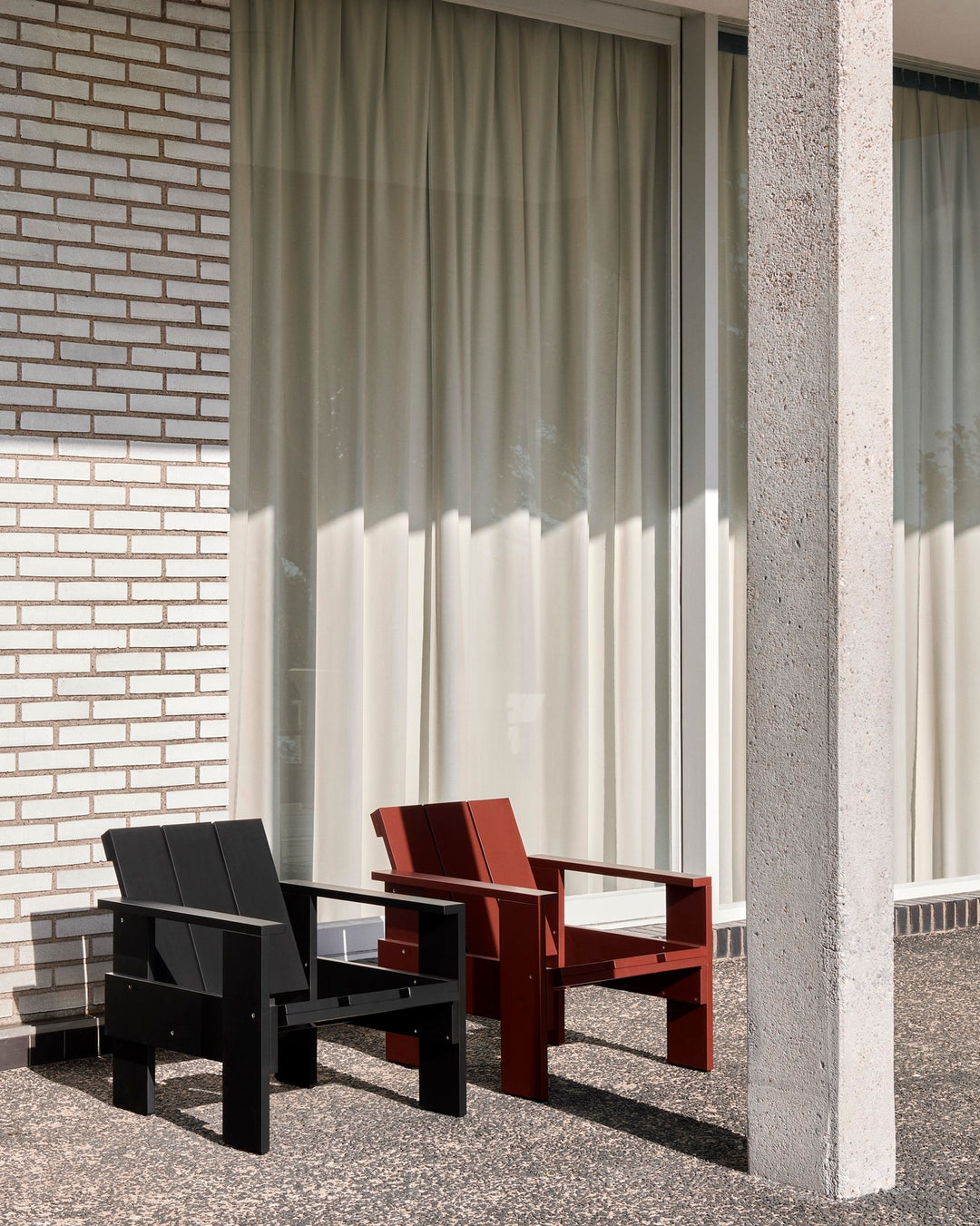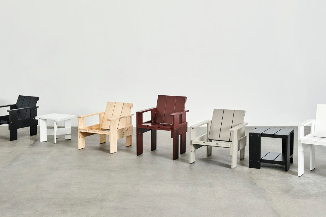 De iconische Crate collectie van Gerrit Rietveld is opnieuw gelanceerd door Hay. Dit ontwerp komt uit 1934. De stoel is oorspronkelijk ontworpen om gebruik te maken van overtollige houten transportkratten.
