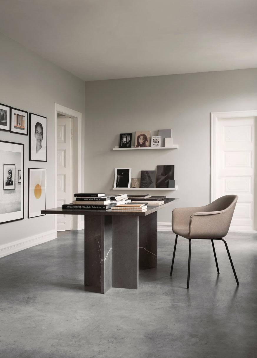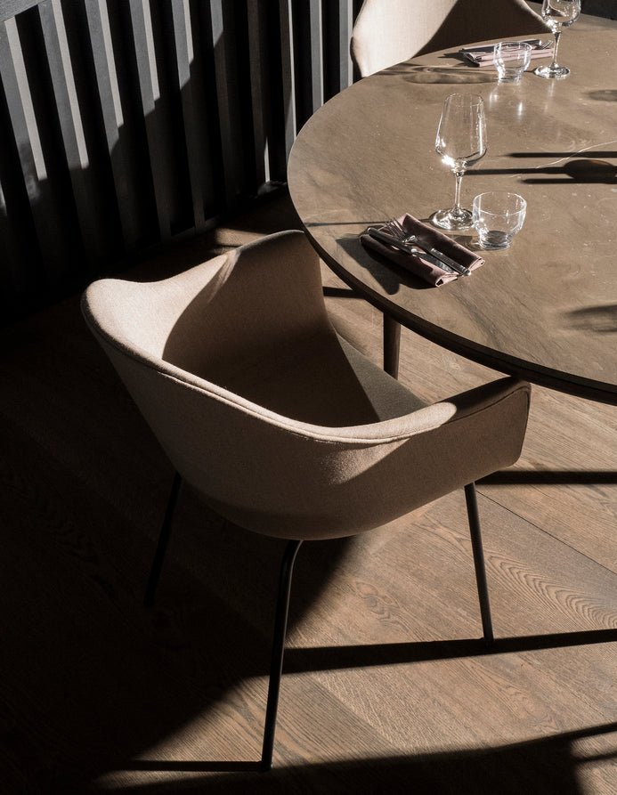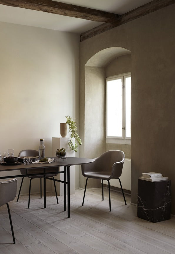 De Harbour Dining chair is een ontwerp van Norm Architects voor Audo. De stoel is een alleskunner; van eetkamerstoel tot werkstoel. De stoel heeft een fijne balans tussen geometrie en organische vormen. Zo buigen de armleuningen van de schaal naar buiten voor maximale ondersteuning. De hoge rugleuning geeft een goede steun waardoor je lang achter elkaar op de stoel kan zitten.
