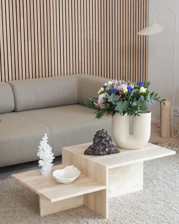 De Distinct salontafel heeft een geometrische vormgeving, die is geïnspireerd door het Japanse minimalisme. Het gekozen materiaal, travertin ofwel kalksteen, past goed bij de koele uitstraling.