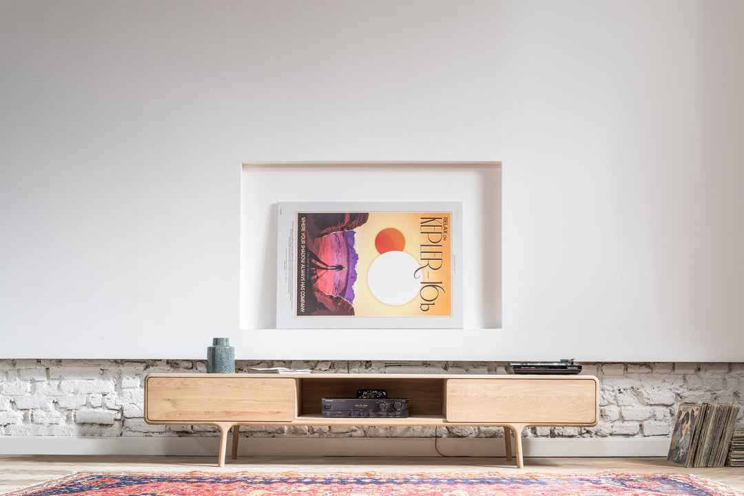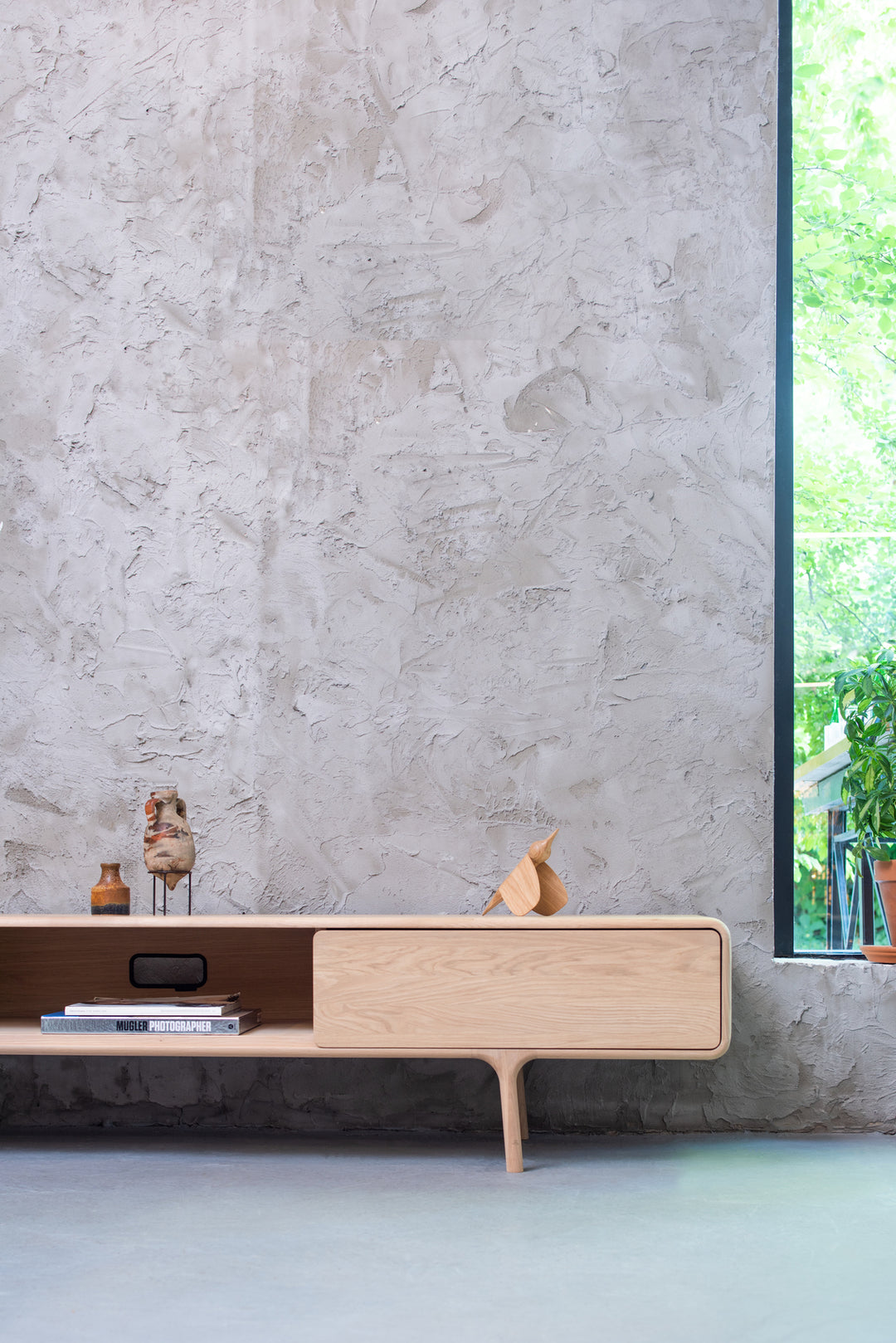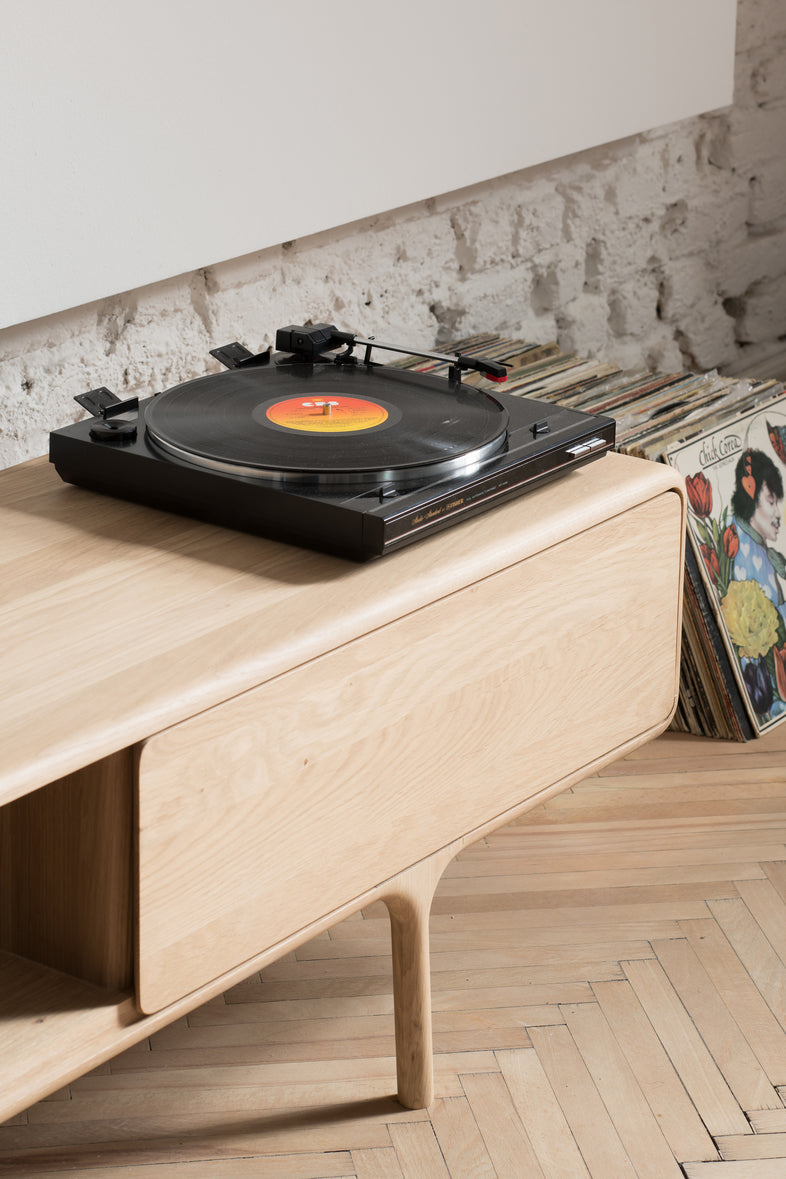 De Fawn Lowboard is gemaakt van massief eikenhout. De kast heeft twee laden en een open vak, of drie laden. Dit tijdloze meubel heeft een Scandinavische uitstraling door het lichte, gladde hout en de afgeronde hoeken.