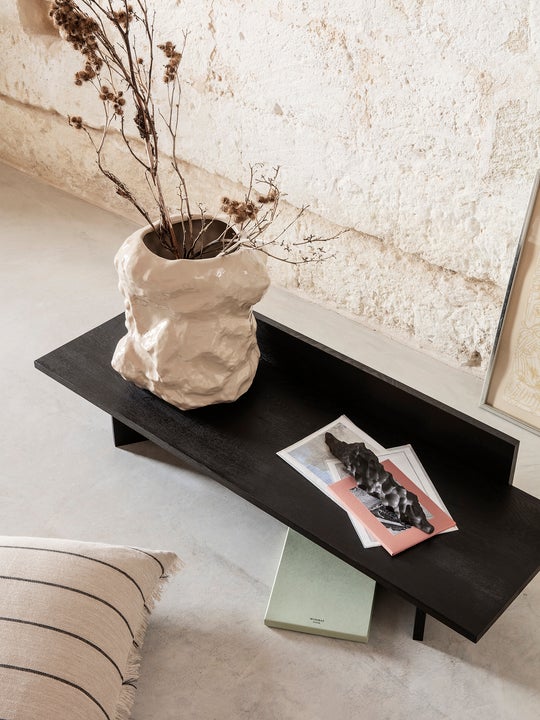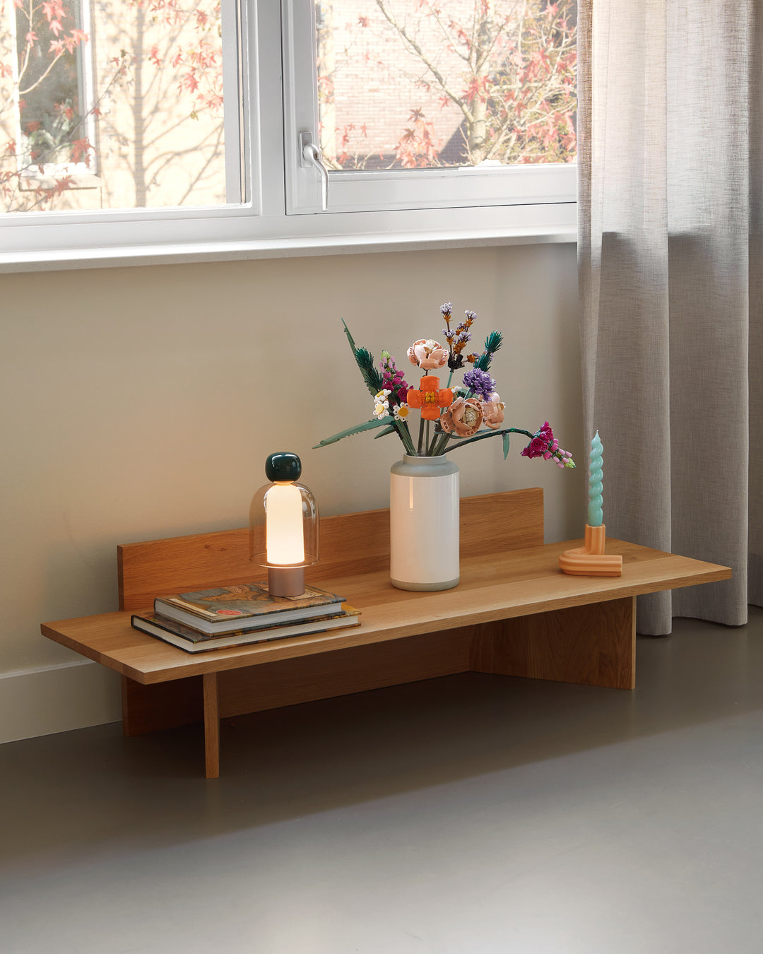 De Oblique bench is een grafisch bijzetbankje waarin invloeden vanuit Japan samenkomen met Scandinavisch design. Je kan de bench gebruiken als een decoratief laag tafeltje om spullen op te tonen of als laag bankje in een hal.