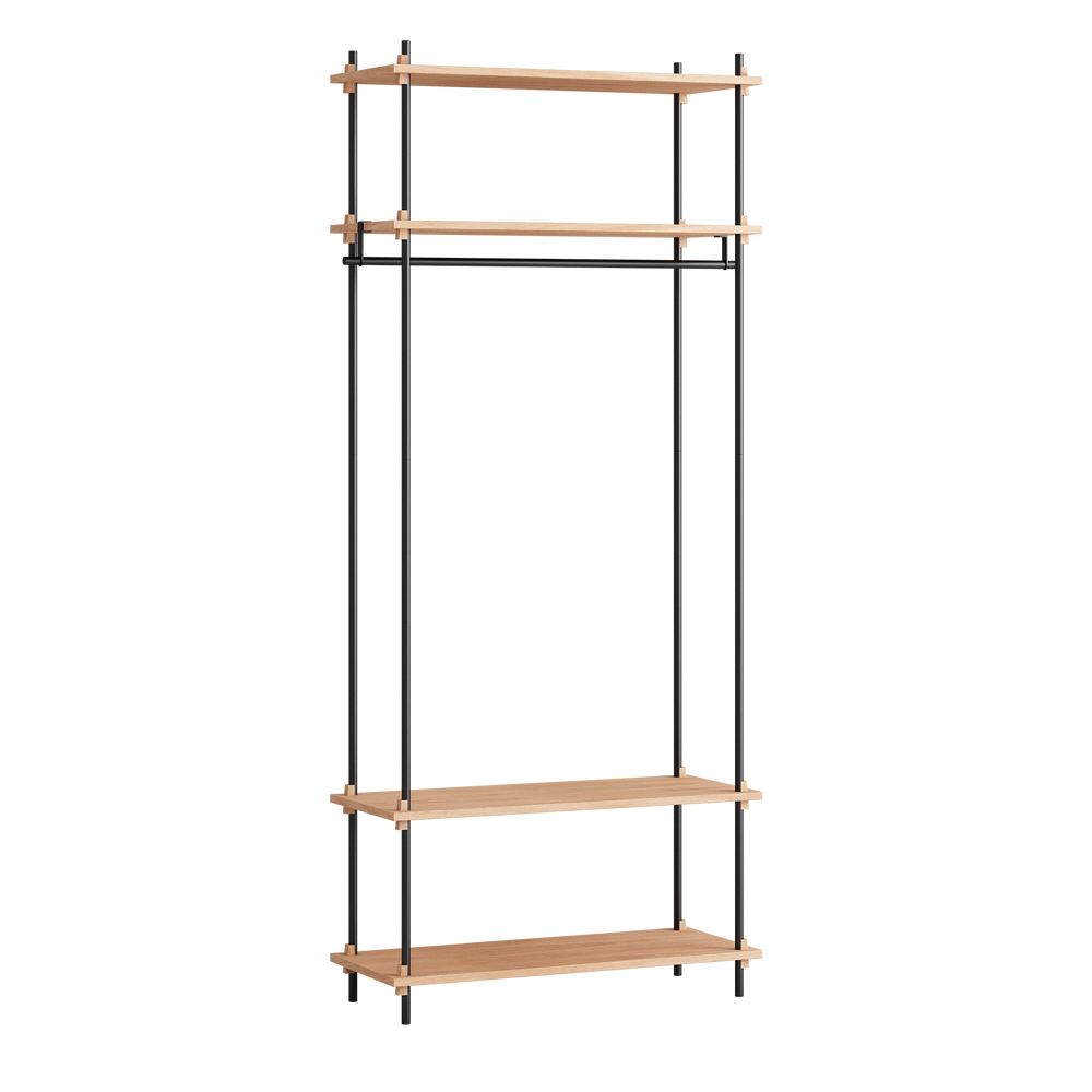 Moebe Shelving System is een modulair opbergsysteem, dat volledig naar wens kan worden samengesteld: hoogte en breedte kunnen aangepast worden aan de ruimte; zelfs bouwen om hoeken of over verschillende niveaus is mogelijk. De legplanken worden bevestigd met massief eikenhouten wiggen. Dat kan op elke gewenste hoogte. Ook kunnen kastjes, een kledingstang of en diepere bureauplank worden toegevoegd.