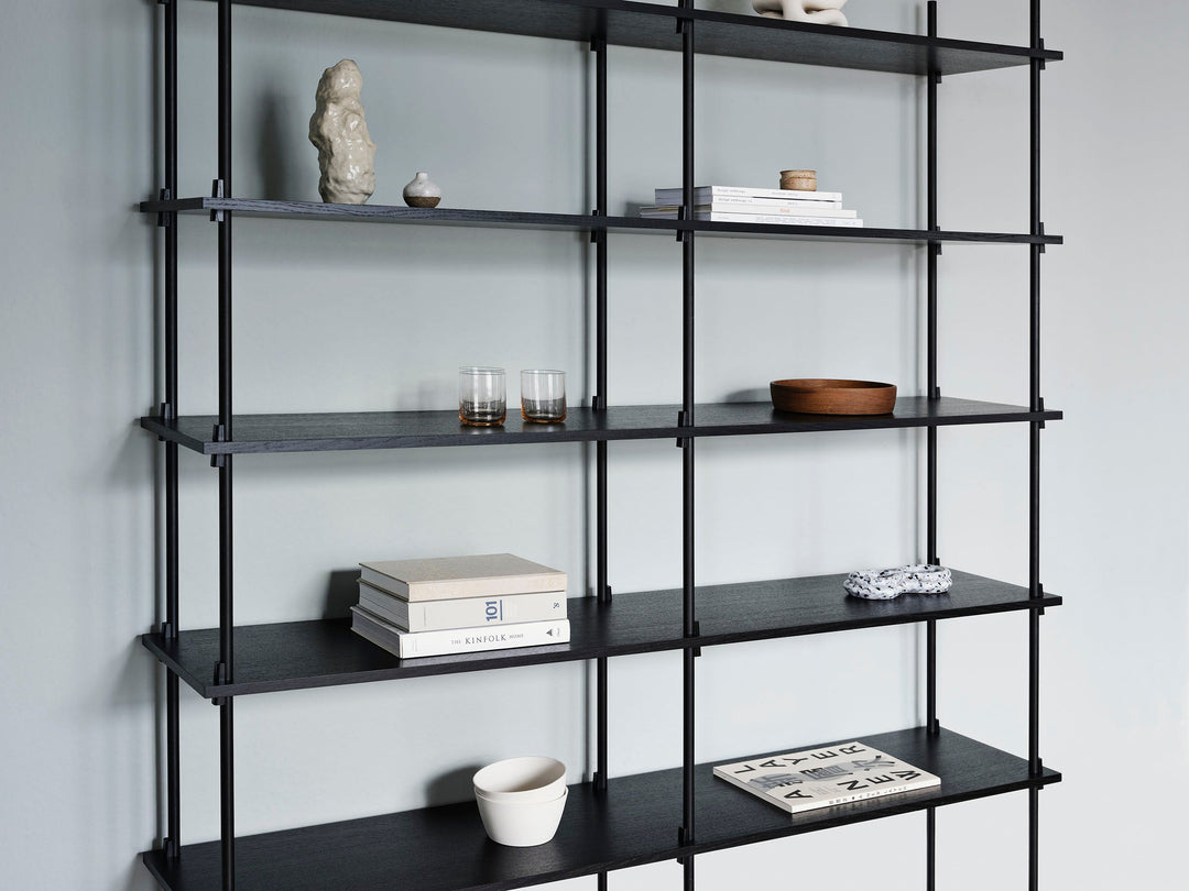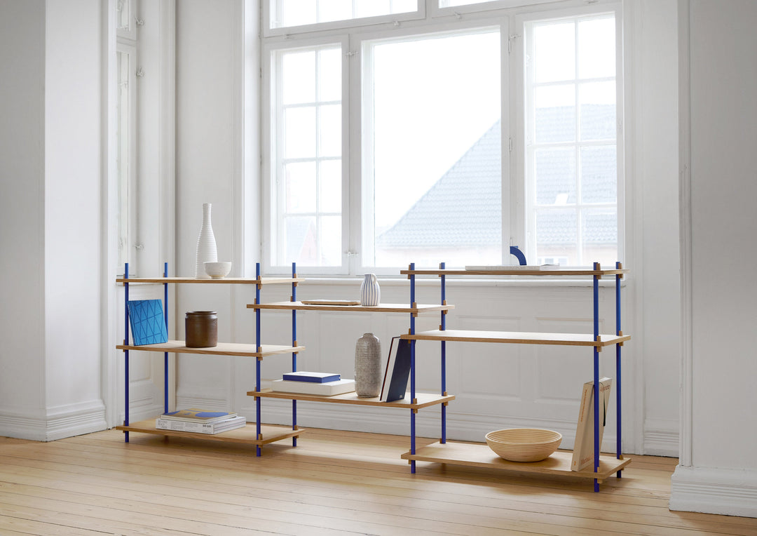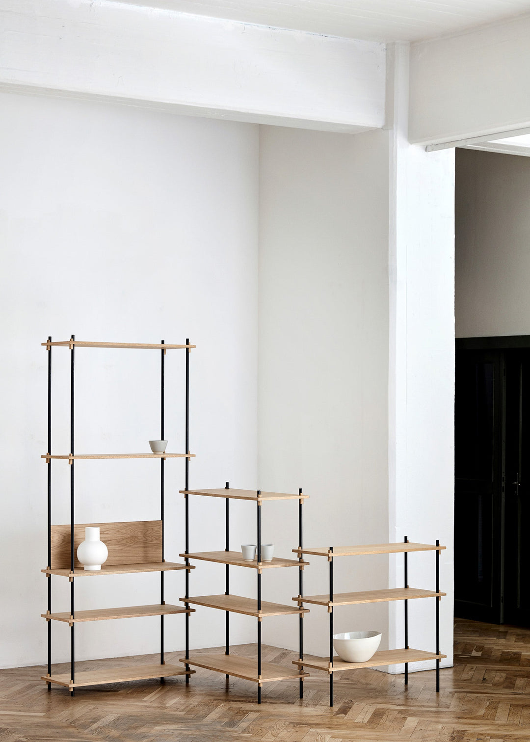 Moebe Shelving System is een modulair opbergsysteem, dat volledig naar wens kan worden samengesteld: hoogte en breedte kunnen aangepast worden aan de ruimte; zelfs bouwen om hoeken of over verschillende niveaus is mogelijk. De legplanken worden bevestigd met massief eikenhouten wiggen. Dat kan op elke gewenste hoogte. Ook kunnen kastjes, een kledingstang of en diepere bureauplank worden toegevoegd.