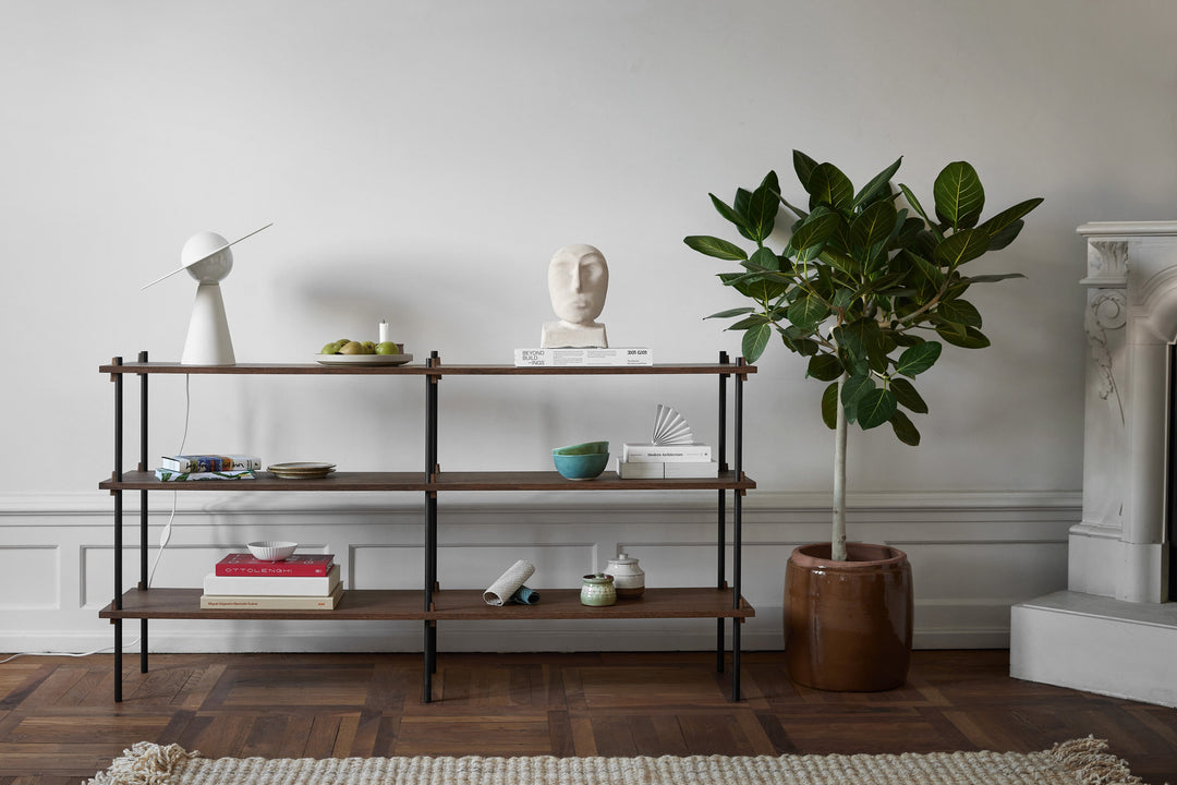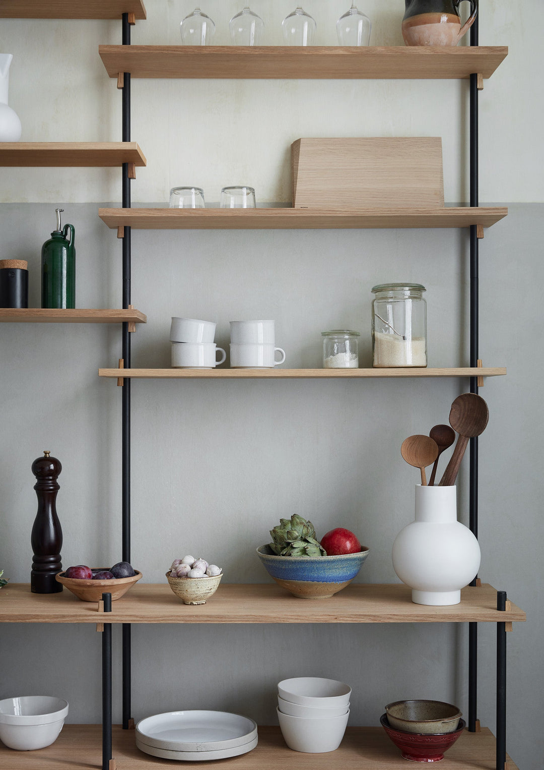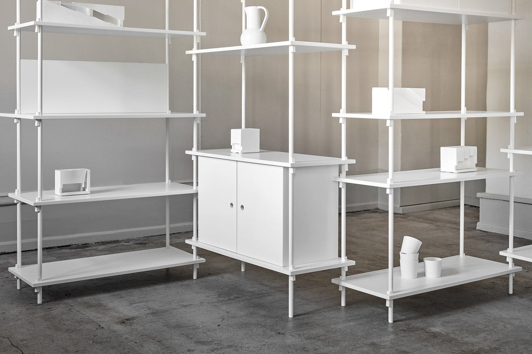 Moebe Shelving System is een modulair opbergsysteem, dat volledig naar wens kan worden samengesteld: hoogte en breedte kunnen aangepast worden aan de ruimte; zelfs bouwen om hoeken of over verschillende niveaus is mogelijk. De legplanken worden bevestigd met massief eikenhouten wiggen. Dat kan op elke gewenste hoogte. Ook kunnen kastjes, een kledingstang of en diepere bureauplank worden toegevoegd.