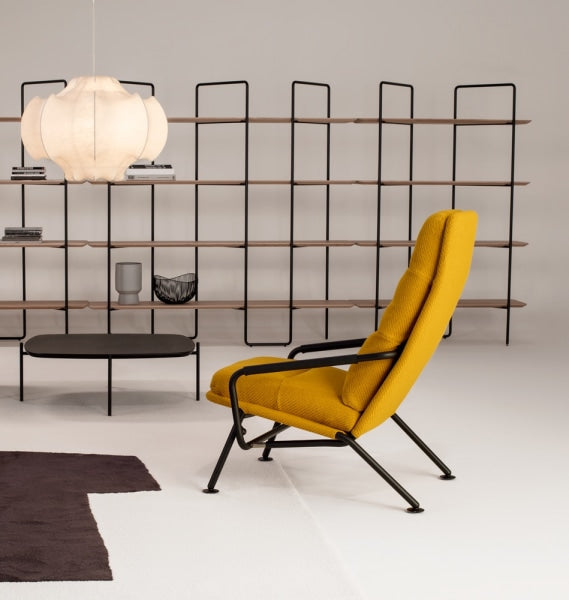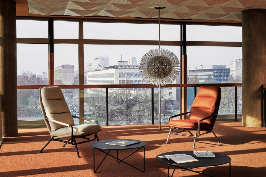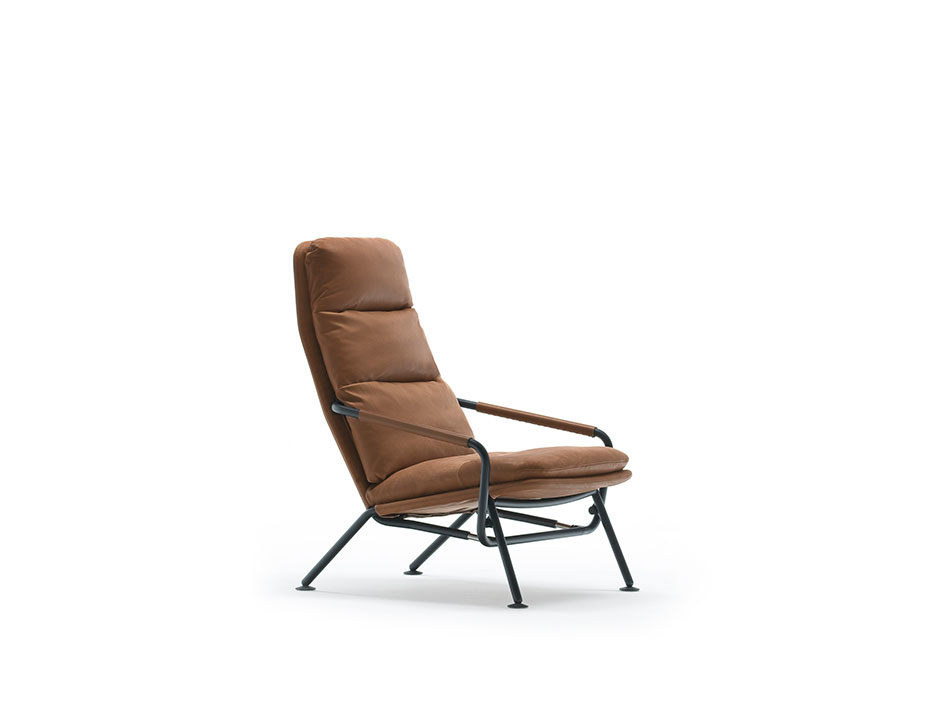 De fauteuil kan uitgevoerd worden in zowel stof als leer. Het frame komt in diverse RAL kleuren of in gepolijst staal.