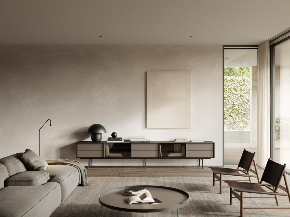 Het getoonde TV-meubel model heeft drie 2-lade modules in Vision Grey en twee open modules in Graphite Black. De open modules kunnen worden afgesloten met de twee schuifdeuren die uitgevoerd zijn met rookglas. De mantel is Kai Black eikenfineer en het frame is gepoedercoat in Graphite Black.