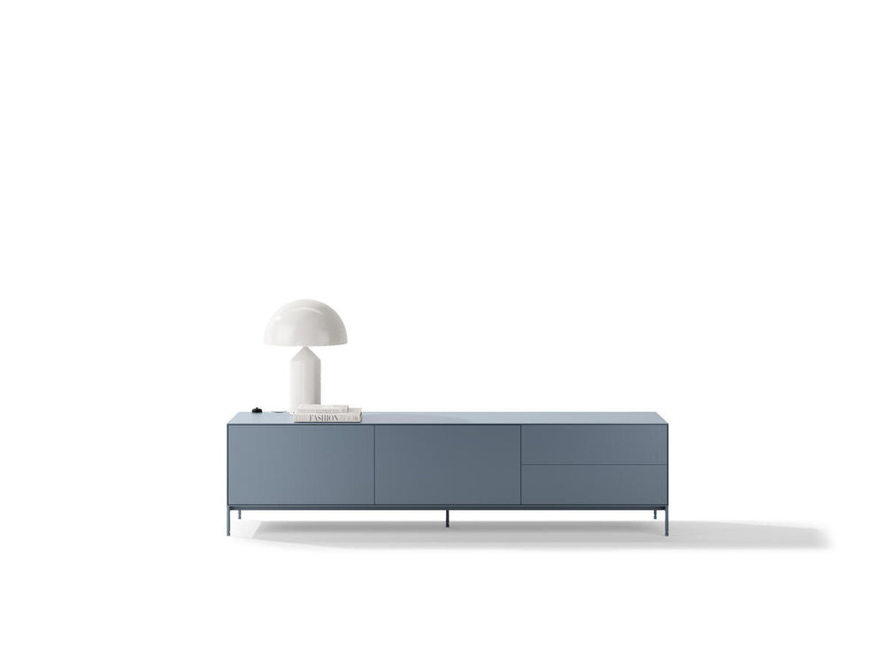 Het getoonde 'Lowboard' model bestaat uit een grote module met twee push-deuren en twee lades. De kast staat op een rank gepoedercoat stalen frame en is volledig uitgevoerd in de kleur Safira Blue.