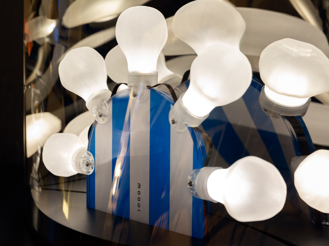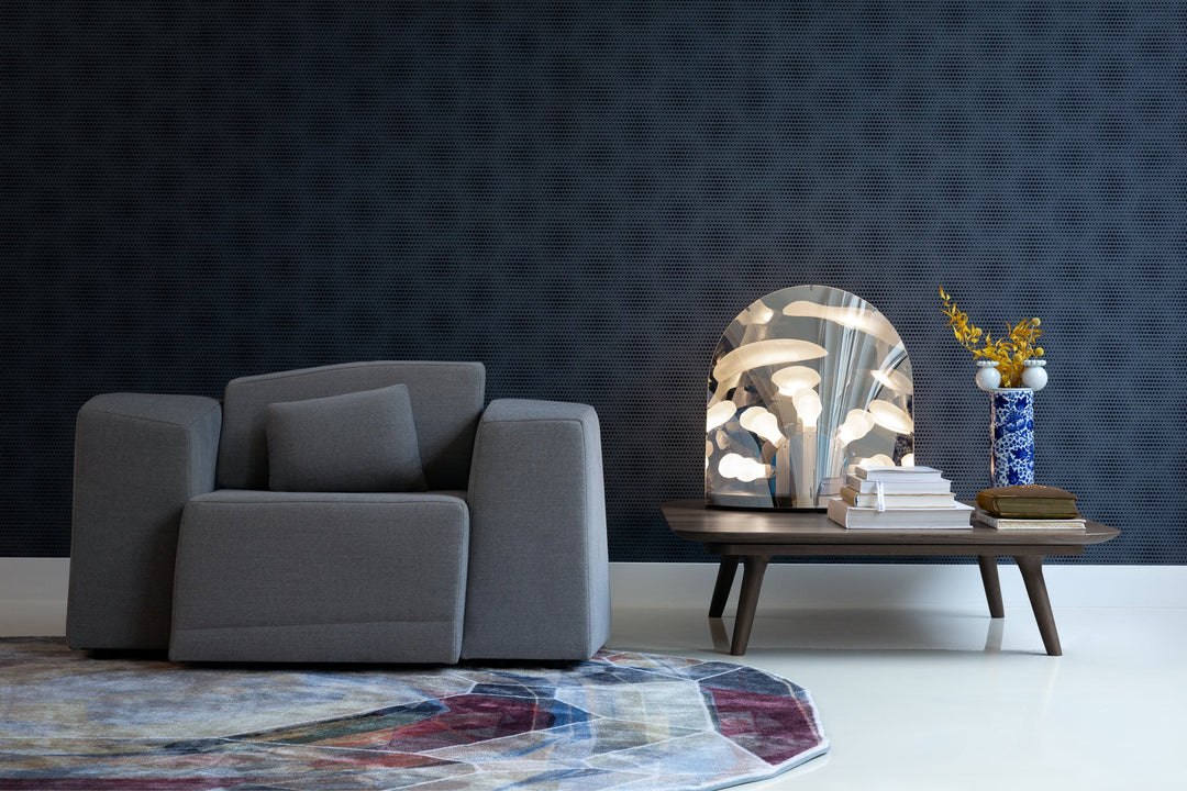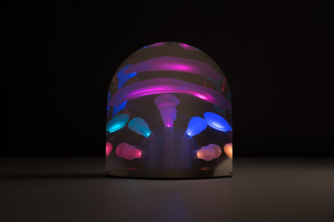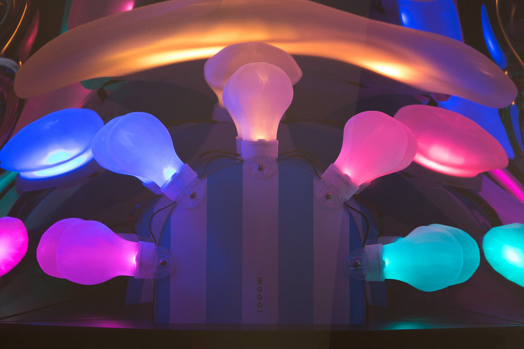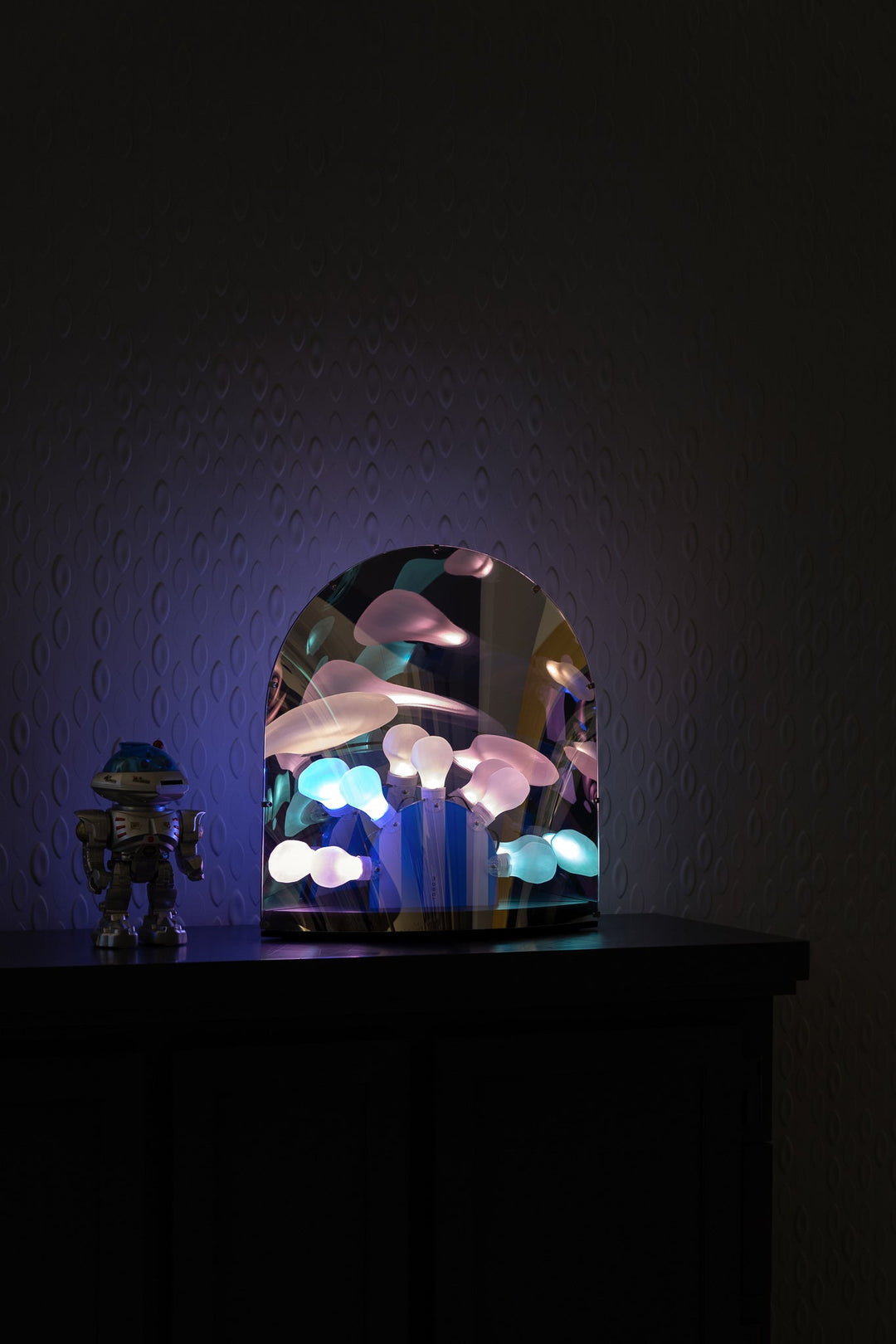 Dim to Disco! De Space tafellamp is zowel een spiegel als een tafellamp. Wanneer de lamp uitstaat reflecteert de spiegel zijn omgeving, maar zodra de lamp aangaat wordt het spiegelende materiaal translucent. De lamp is van warm wit licht te dimmen naar zachte pasteltonen, maar zodra de dimmer volledig opengedraaid wordt zal de disco van start gaan.