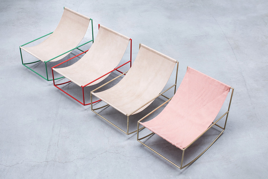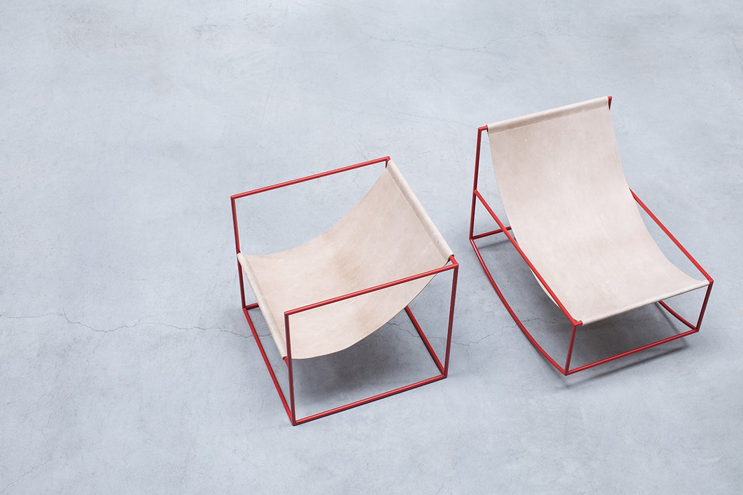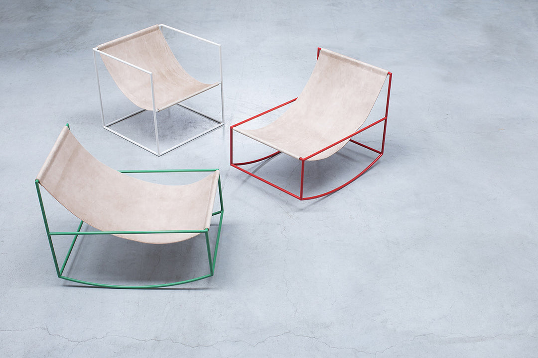 Deze minimalistische schommelstoel van Muller Van Severen voor Valerie Objects is een variant op de iconische Duo Seat. Het concept is een stoel bestaande uit niets meer dan een stalen frame en een lap van leer of linnen. Een van de ontwerpfilosofieën van Muller Van Severen is visuele luchtigheid, iets wat zeer duidelijk terugkomt in dit ontwerp.