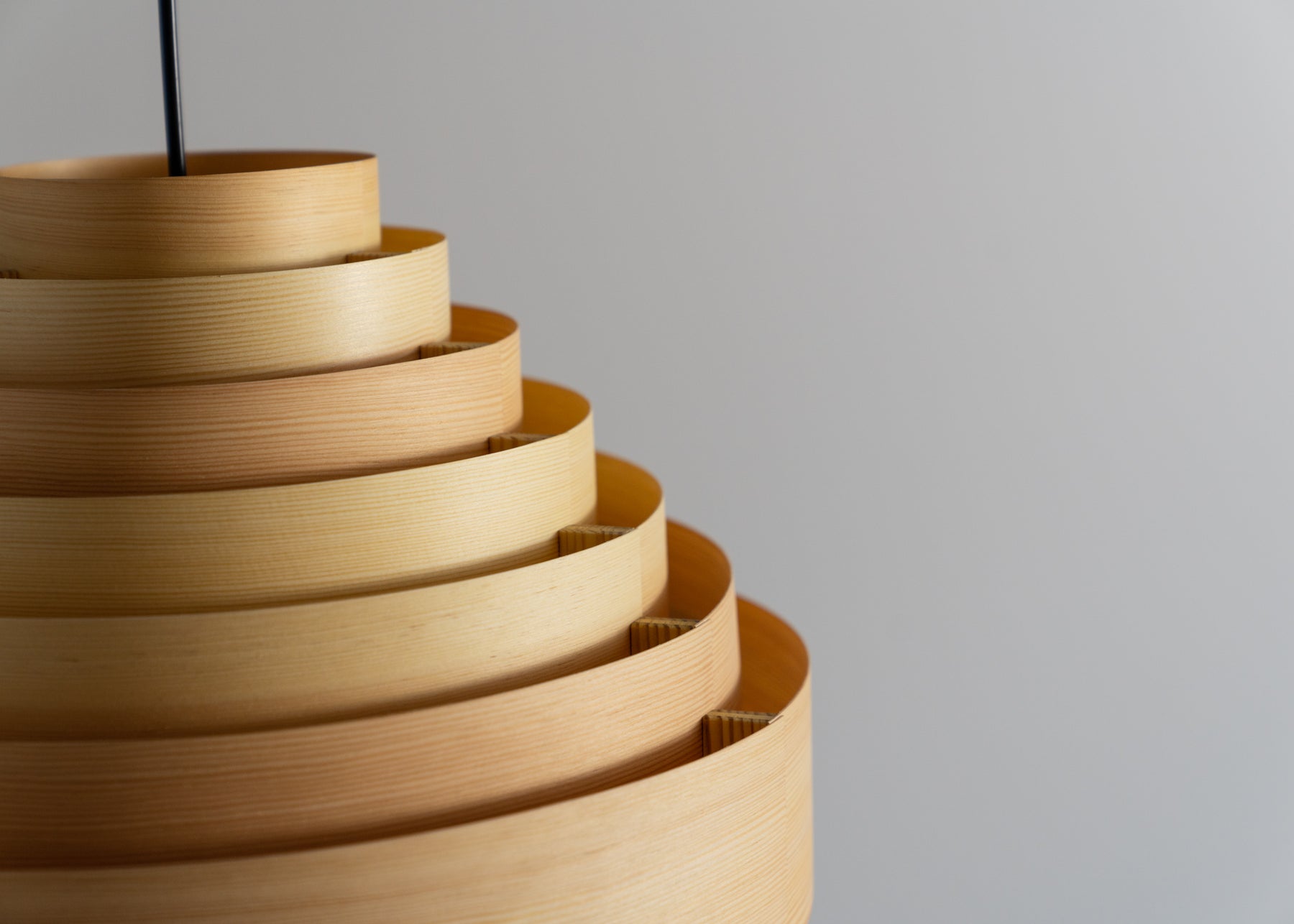 Vaarnii heeft drie hanglampen van Jakobsson opnieuw ontworpen met massief Fins grenenhout als basis, en voor de ronde stroken hoogwaardig grenenfineer. De lampen worden gemaakt in Finland.