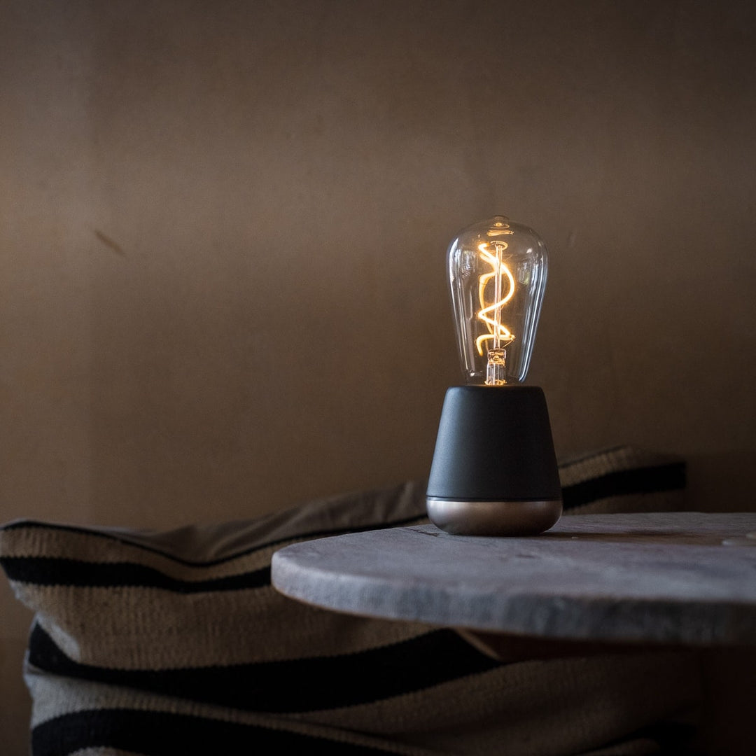 De Humble One is een oplaadbare tafellamp die je gemakkelijk overal mee naar toe neemt. Het licht kan in drie sterktes ingesteld worden. Op die manier kan je hem op de eettafel toepassen voor gezellig kaarslicht, meenemen naar de buitentafel op een mooie zomeravond, of hem als nachtlampje gebruiken om een boek bij te lezen. De lamp heeft op de laagste stand ongeveer 140 branduren de lamp laad zichzelf op in ongeveer 4 uur. De lichtbron bevat een E27 fitting en is daardoor gemakkelijk te vervangen. De lamp is verkrijgbaar in verschillende kleuren. De accu is oplaadbaar met de bijgeleverde USB kabel of via een draadloos oplaadplateau.