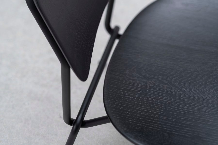 De Strain-serie bestaat uit eetkamerstoelen, een fauteuil, barkrukken en bijpassende tafels in diverse maten.