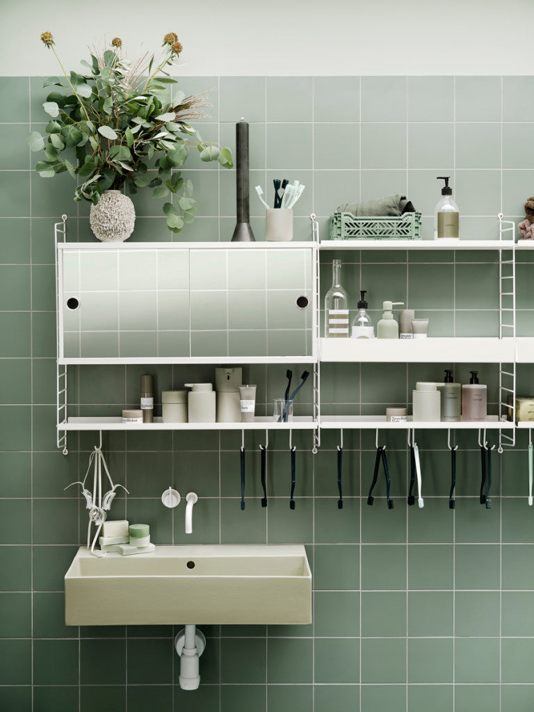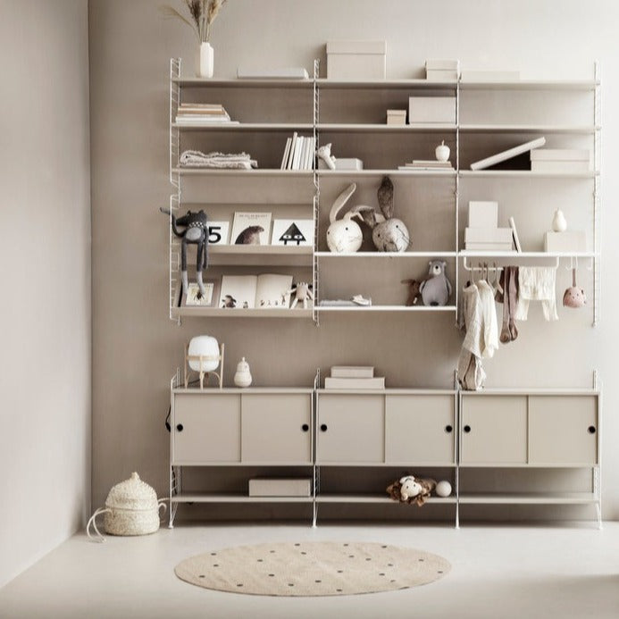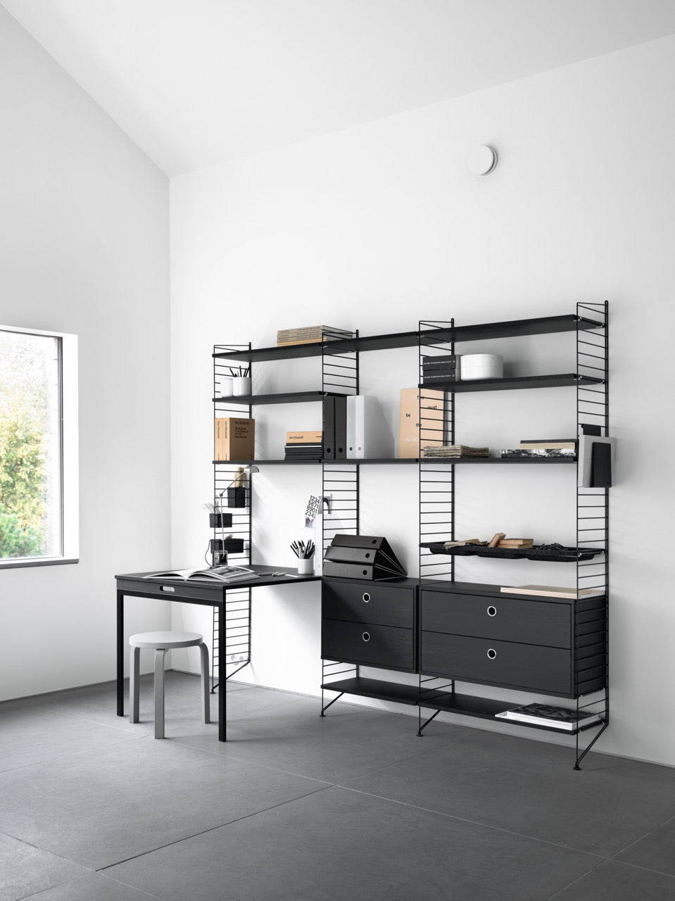 Het String systeem is een modulaire wandkast die is opgebouwd uit losse elementen. Dit tijdloze systeem is ontworpen in 1949 en is met recht een designklassieker uit Zweden. De basis wordt gevormd door twee of meer beugels, waartussen planken worden geplaatst. Die kunnen worden aangevuld met kastelementen. De kasten worden geleverd met onder meer schuifdeuren en draaideuren; ook verkrijgbaar: een vitrinekast, archiefkast en ladeblok. Er zijn metalen geperforeerde planken, metalen schoenen planken, een plank voor tijdschriften en een plastic plank met bakjes. Kortom: de mogelijkheden zijn talrijk. Zo bepaal je zelf volledig de indeling, de materialen en kleuren. Bij de kast zijn losse accessoires verkrijgbaar, zoals een gegalvaniseerde achterwand, en een opvouwbare tafel.
