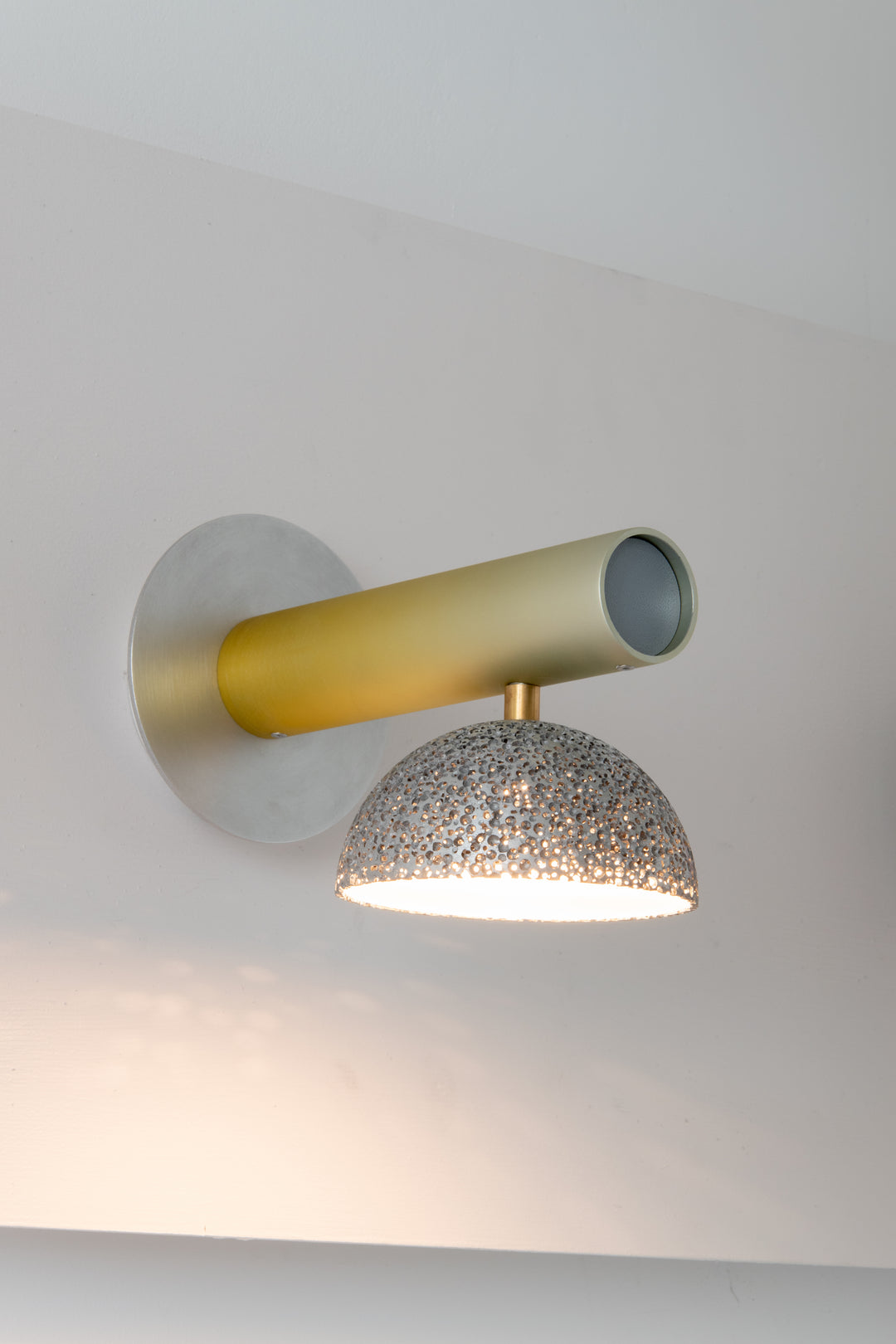 De Aero Light wandlamp van ARRAY is gemaakt met lampenkappen van aluminiumschuim gemonteerd op aluminium profielen, die functionaliteit en esthetiek combineren. Dit materiaal wordt gemaakt door gas te injecteren in gesmolten aluminium, waardoor een poreuze structuur ontstaat wanneer het afkoelt en stolt. Dit innovatieve ontwerp zorgt voor een efficiënte warmteafvoer en een unieke decoratieve uitstraling, waardoor de Aero Light zowel een praktische als elegante verlichtingsoplossing is.