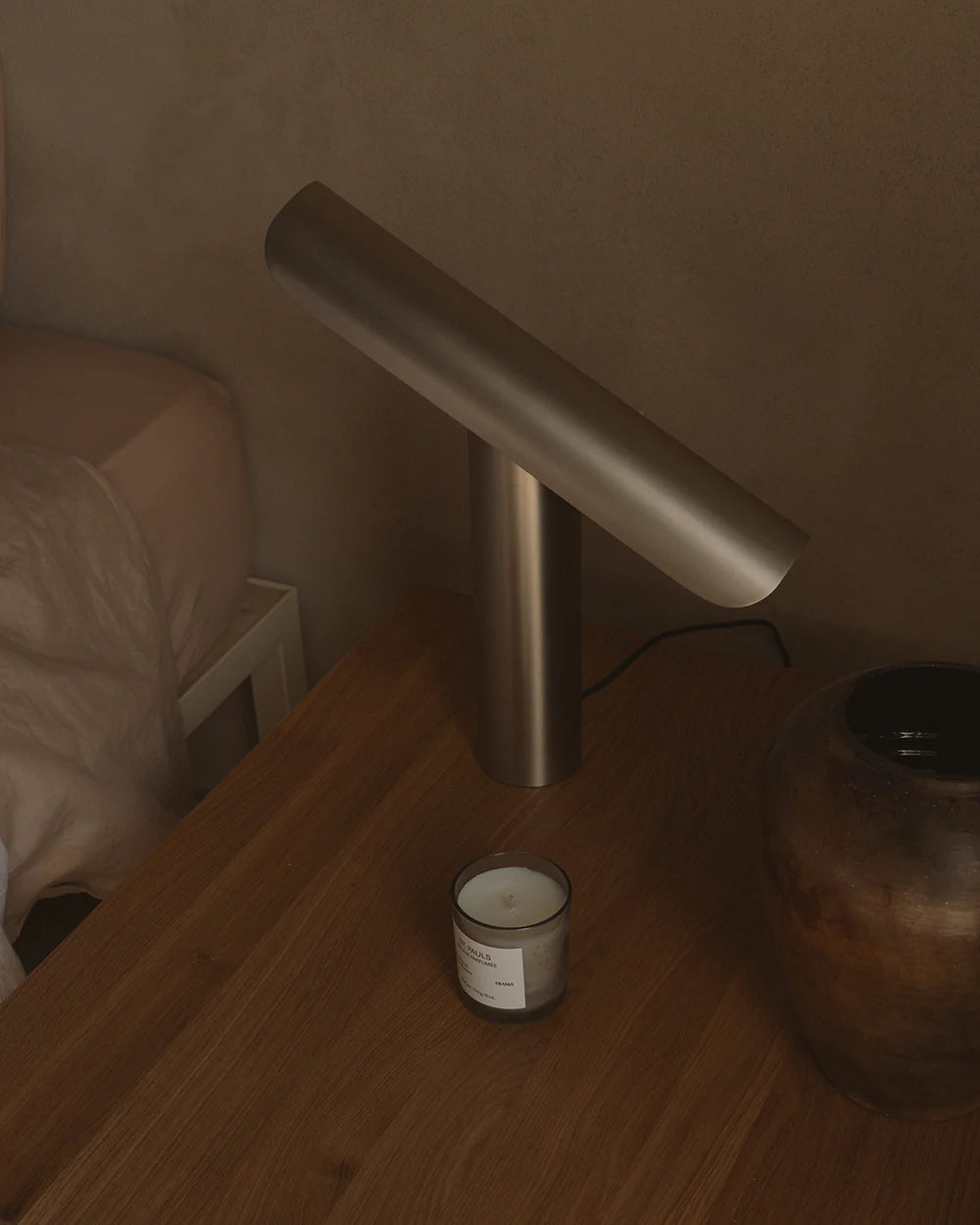 De T-Lamp van FRAMA is een minimalistische lamp met een bijzonder mechaniek. Hierdoor kan de lampenkap kantelen en licht schijnen onder verschillende hoeken.